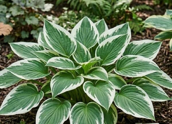 Bold, dark green leaves with striking pure white margins. This Hosta features dense, mounded growth and lavender blooms for high-impact shade contrast.